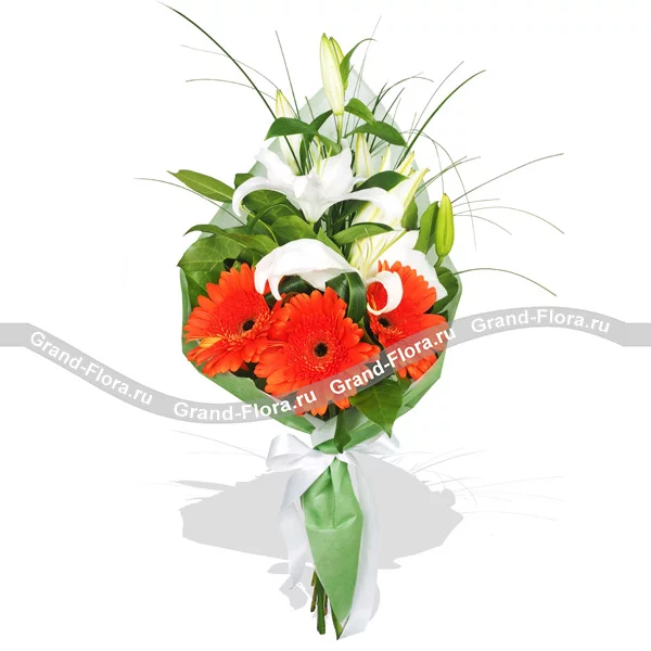 Уменьшенный: лилия белая - 1 шт., гербера орнажевая - 2 шт., берграс, салал, фетр зеленый.