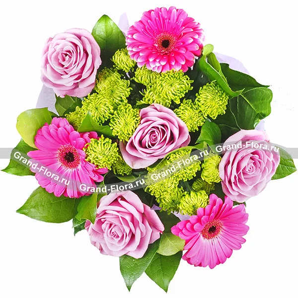 Великолепное сочетание элегантных розовых роз, ярких малиновых гербер и зеленых кустовых хризантем выгодно подчеркнуто салалом и упаковкой из фетра.