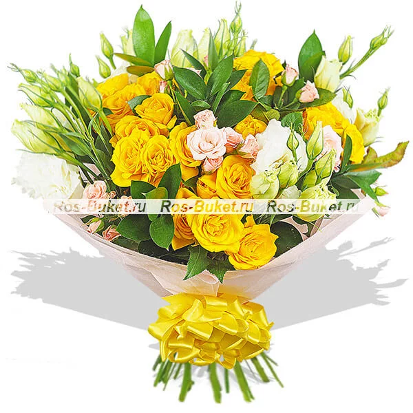 ЛЮКС: роза кустовая желтая - 7 шт, роза кустовая розовая - 5 шт, эустома белая - 7 шт, рускус, фетр розовый, бант желтый.