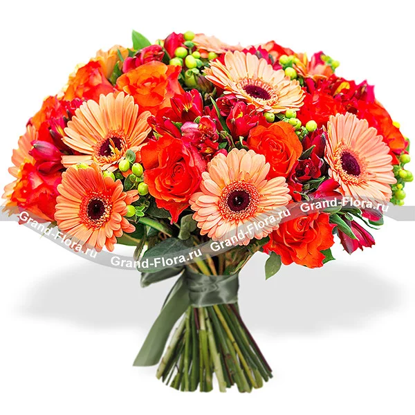 Роза оранжевая - 9 шт., гербера оранжевая - 7 шт., альстромерия бордовая - 5 шт., гиперикум - 5 шт., лента зеленая.