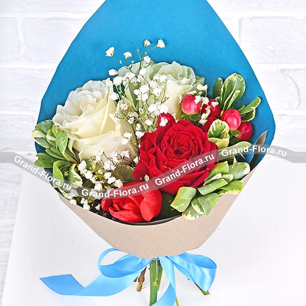 Стандартный: роза красная - 1 шт., роза белая - 2 шт., тюльпан красный - 2 шт., гиперикум, зелень, упаковка, лента. Примерный размер: 20Х25 см.