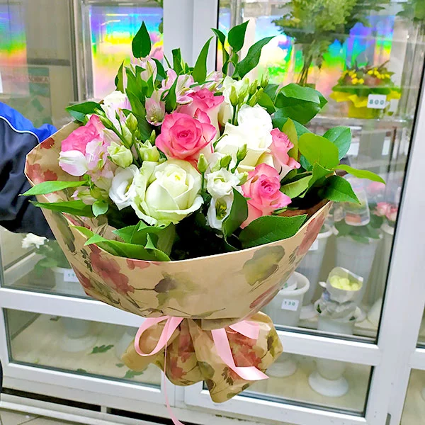 Роза белая- 5 шт., эустома розовая – 5 шт., альстромерия фиолетовая/розовая – 5 шт., декоративная зелень (эвкалипт) – 3 шт., упаковка, лента.